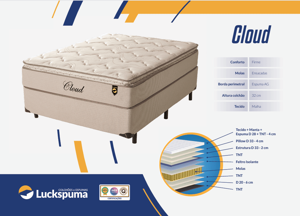 O Cloud da Luckspuma é um colchão de molas ensacadas com altura de 32 cm, projetado para oferecer conforto firme e suporte para até 120-150 kg por pessoa. Ele combina o sistema de molas individuais com espuma D33, tem tratamento antiácaro, antifungo e antialérgico, além de um pillow top com tecnologias como aloe vera.Características principais